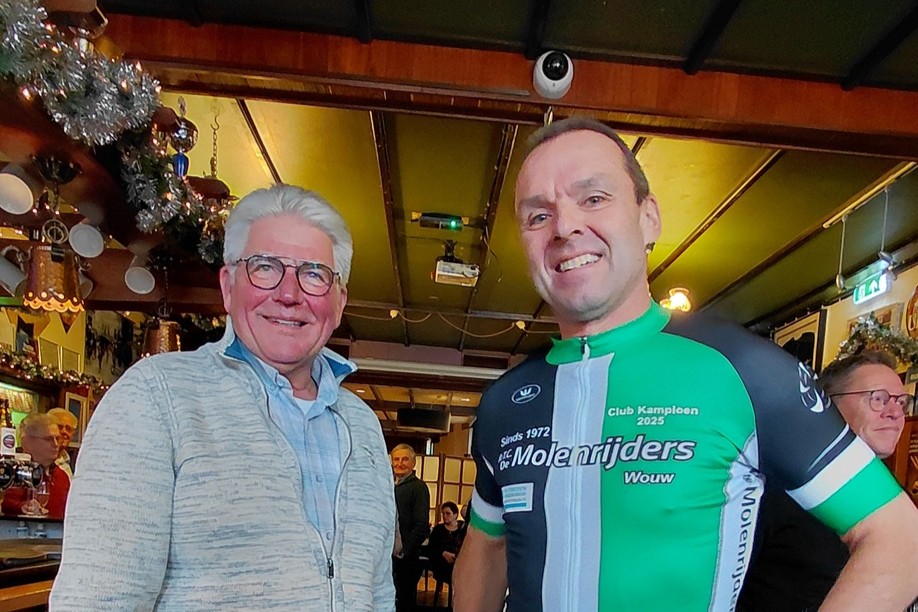 En als slot van het officiële gedeelte van deze nieuwjaarsreceptie werd wederom André Volkers uitgeroepen tot clubkampioen. Door de combinatie van vele ritten en een mooie tijdrit heeft André in 2025 de meeste punten behaald. En daarmee is hij de terechte clubkampioen van 2025! Hij heeft daarmee zijn titel van 2024 geprolongeerd. Uit handen van de de voorzitter en de sponsor ontving André de wisselbeker, het kampoensshirt, een cadeaubon en een bos bloemen. Proficiat!